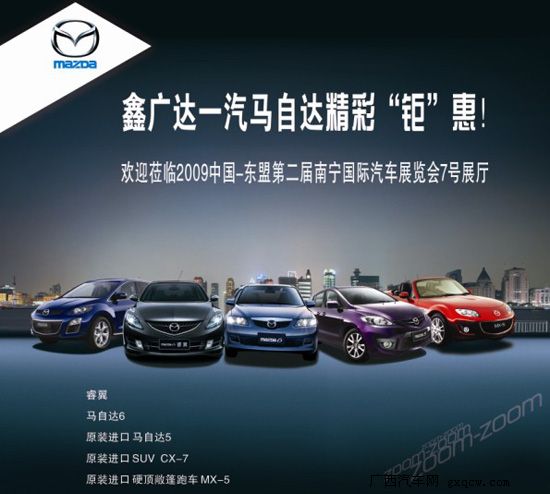 一年一度的第二屆南寧國際汽車盛會即將開始!今年鑫廣達一汽馬自達將攜一汽馬自達全家成員:精英座駕王中王——睿翼、家用轎車的最佳選擇——一代馬自達6、高性能動感MPV——原裝進口馬自達5、史上銷量最多的雙座硬頂敞篷跑車——原裝進口馬自達MX-5以及剛剛上市的史上最靚麗SUV原裝進口馬自達CX-7,強勢出擊國際車展!