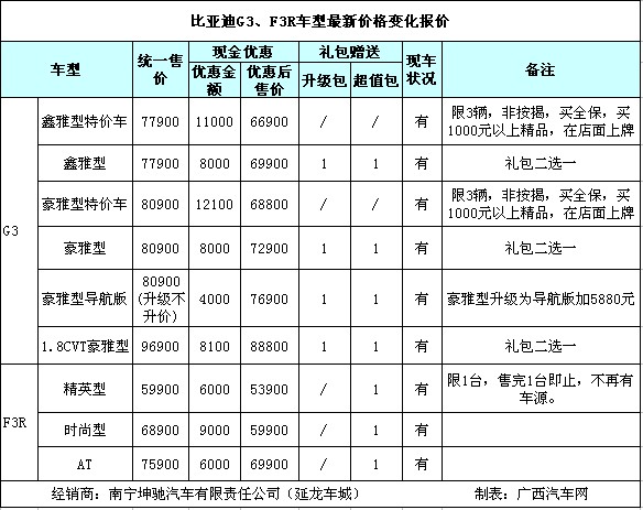 比亞迪G3擁有豐富的配置以及中級(jí)車的空間標(biāo)準(zhǔn),高性價(jià)比更是比亞迪G3所具備的。近日,編輯從南寧坤馳汽車有限公司(延龍車城)了解到,目前比亞迪G3最高優(yōu)惠12100元現(xiàn)金,F(xiàn)3R最高優(yōu)惠9000元現(xiàn)金,部分車型還有超值禮包贈(zèng)送,現(xiàn)車均為為充足。具體車型價(jià)格行情如下: