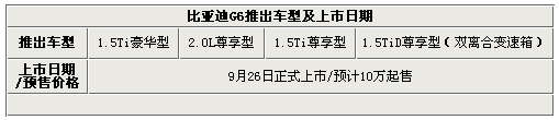 原比亞迪股份前副總裁夏治冰曾在今年6月4日新浪微博透露“G6目前已進(jìn)入上市準(zhǔn)備階段,預(yù)計(jì)9月上市”。近期據(jù)編者走訪幾家經(jīng)銷商了解到,比亞迪G6定于9月26日正式上市,根據(jù)以往G3和F3產(chǎn)品規(guī)劃的關(guān)系,預(yù)計(jì)售價(jià)10萬(wàn)元起步。據(jù)銷售稱,展車預(yù)計(jì)9月底到店,主要的競(jìng)爭(zhēng)對(duì)手鎖定在帝豪EC8、奔騰B70、傳祺等熱銷車型。
