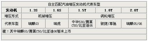 自主車型方面,現(xiàn)在市面上技術(shù)較成熟汽油渦輪增壓引擎基本上以中華駿捷、尊馳1.8T及奇瑞瑞麒的G5、G6的2.0T等為代表,而機(jī)械增壓方面基本上以奇瑞瑞虎1.6S等車型為代表。除匹配1.5T的中華H530、騰翼C50、比亞迪G6外,奇瑞的匹配在瑞麒G3上的1.3S及吉利1.3T搭載多款車型都在緊張的研發(fā)當(dāng)中。