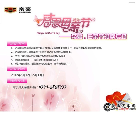 1、 活動(dòng)期間提車或訂車客戶均可贈(zèng)送母親節(jié)親情蛋糕及卡片,為辛苦的媽媽送去你的愛意。