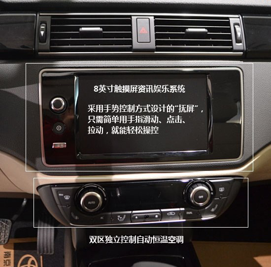 觀致3的中控臺(tái)最顯眼處配備了8英寸觸摸屏資訊娛樂(lè)系統(tǒng)。這套云集高端軟件、技術(shù)以及圖形元素的系統(tǒng)完全由觀致汽車自行研發(fā),旨在讓駕駛者在駕駛過(guò)程中花費(fèi)最少的精力進(jìn)行信息操作并輕松得以實(shí)現(xiàn)。和其他車型使用很多按鈕來(lái)實(shí)現(xiàn)功能切換不同,用戶可在觀致設(shè)計(jì)的用戶界面上“滑動(dòng)”手指來(lái)使用娛樂(lè)、導(dǎo)航、互聯(lián)和車內(nèi)聯(lián)網(wǎng)功能,就像使用智能手機(jī)一樣。