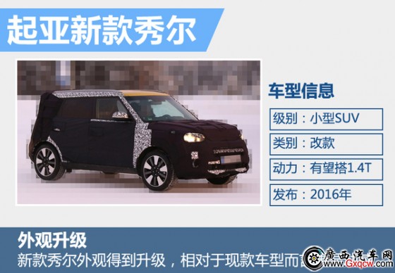 東風(fēng)悅達(dá)起亞旗下目前共有智跑、獅跑、KX3(傲跑)以及秀爾4款SUV車型,現(xiàn)款在售秀爾上市已超過兩年的時間,如今將迎來改款車型。近日,網(wǎng)通社獲取了一組起亞新款秀爾的諜照,新車外觀得到升級,基于中國市場對于起亞汽車的重要性,新車有望同步引入國內(nèi),F(xiàn)代起亞集團(tuán)全新的1.4T渦輪增壓發(fā)動機(jī)已經(jīng)正式發(fā)布,動力輸出全面超越現(xiàn)款秀爾搭載的1.6升自然吸氣發(fā)動機(jī),新款秀爾有望換搭1.4T,產(chǎn)品競爭力將得到大幅提升。