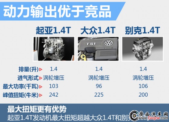 起亞1.4T實際上是繼2.0T、1.6T之后的第三款增壓發(fā)動機(jī),目前各大車企相繼在國內(nèi)汽車市場推出小排量增壓發(fā)動機(jī),如大眾朗逸采用的1.4T和別克昂科拉所采用的1.4T等。通過對三者相同排量的渦輪增壓發(fā)動機(jī)進(jìn)行動力對比可以發(fā)現(xiàn),起亞1.4T增壓發(fā)動機(jī)最大輸出功率超越大眾1.4T,但與別克1.4T相比仍有差距,不過最大扭矩起亞1.4T在三者中最具優(yōu)勢。