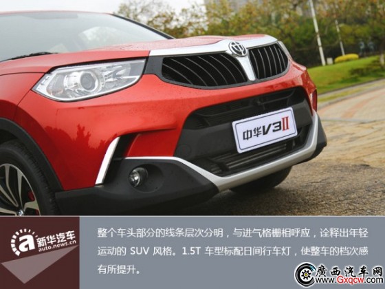 中華V3二代前部造型采用了家族式臉譜設(shè)計(jì),亞光黑與亞光銀搭配的直瀑式進(jìn)氣格柵一定程度增強(qiáng)了立體感。整個(gè)車頭部分的線條層次分明,與進(jìn)氣格柵相呼應(yīng),詮釋出年輕運(yùn)動(dòng)的SUV風(fēng)格。1.5T車型標(biāo)配日間行車燈,使整車的檔次感有所提升。