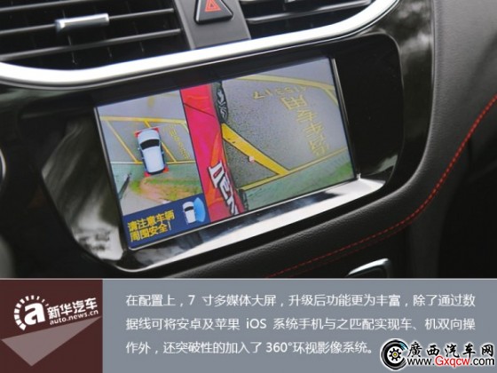在配置上,7寸多媒體大屏,升級(jí)后功能更為豐富,除了通過數(shù)據(jù)線可將安卓及蘋果iOS系統(tǒng)手機(jī)與之匹配實(shí)現(xiàn)車、機(jī)雙向操作外,還突破性的加入了360°環(huán)視影像系統(tǒng),在原有車型基礎(chǔ)上增添四顆攝像頭,分別位于車頭、左右后視鏡及車尾,超寬視角,無縫拼接的適時(shí)圖像信息徹底消除車輛周圍的視覺盲點(diǎn)。