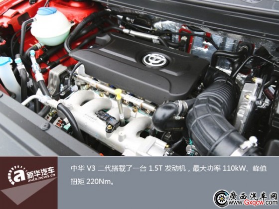 中華V3二代搭載了一臺(tái)1.5T發(fā)動(dòng)機(jī),最大功率110kW、峰值扭矩220Nm。這臺(tái)發(fā)動(dòng)機(jī)是華晨自主研發(fā)的發(fā)動(dòng)機(jī),采用了輕量化設(shè)計(jì),同時(shí)具有四氣門雙頂置凸輪軸、連續(xù)可變氣門正時(shí)系統(tǒng)等技術(shù)。