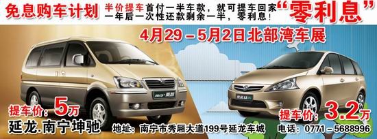 北部灣車展將于2011年4月29日-5月2日在南寧國(guó)際會(huì)展中心舉辦(風(fēng)行展位:G4-G5),屆時(shí)風(fēng)行汽車南寧坤馳4S店將繼續(xù)推出“免息購(gòu)車計(jì)劃”:半價(jià)提車,零利息!的促銷政策,讓你提前享受有車生活!為了免除您在車展現(xiàn)場(chǎng)的擁擠、風(fēng)吹日曬雨淋,南寧坤馳4S店在車展期間特別推出風(fēng)行汽車輕松購(gòu):