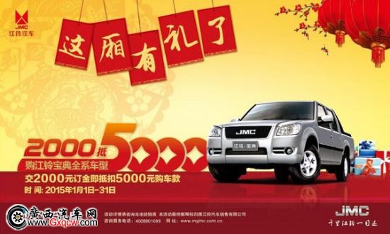 春節(jié)將至,購(gòu)車高峰也隨之而來(lái)。值此之際,江鈴汽車為滿足市場(chǎng)需求,降低購(gòu)車成本,特大范圍開(kāi)展了“訂購(gòu)寶典全系車型交2000元定金抵交5000元購(gòu)車款優(yōu)惠促銷活動(dòng)”。此次促銷讓購(gòu)車者享受到最實(shí)在的優(yōu)惠。有購(gòu)車需求的朋友,時(shí)機(jī)難得,還不趕快行動(dòng)?經(jīng)銷商熱線:0771-3800599.
