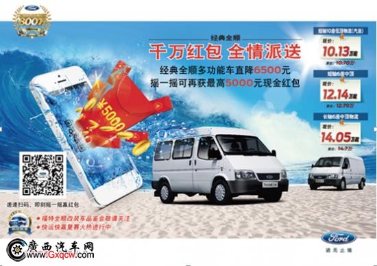 炎炎夏日,如何調(diào)動你的購車熱情?江鈴福特全順****的冰點促銷震撼來襲,即日起至8月31日到廣西江鈴安吉4S店選購經(jīng)典全順多功能系列,均可參與福特全順官方微信“搶紅包”活動,紅包金額*高達到5000元,所得紅包可直接用于車款抵扣。同時,還可再享現(xiàn)金讓利1500元。搖微信“福特全順”100%中獎!你準(zhǔn)備好了嗎?咨詢熱線:0771-3119811.