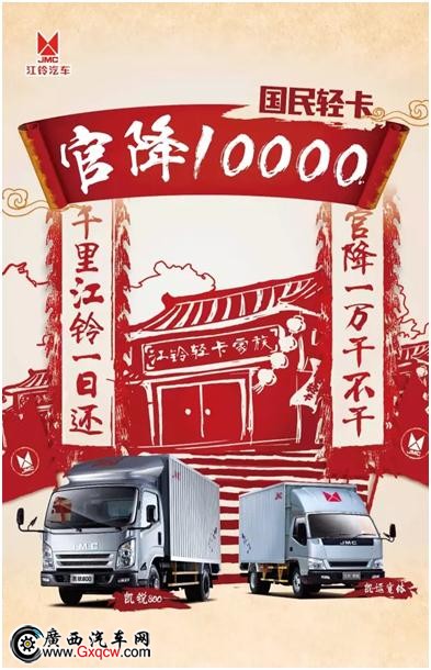 獨(dú)樂(lè)樂(lè)不如眾樂(lè)樂(lè),新年新驚喜,江鈴輕卡重磅級(jí)的福利降臨,即日起至1月31日購(gòu)江鈴輕卡凱銳N800車(chē)型即可享受現(xiàn)金直降10000元,歡迎廣大朋友來(lái)店咨詢(xún)搶購(gòu)。咨詢(xún)熱線(xiàn):0771-3119811.