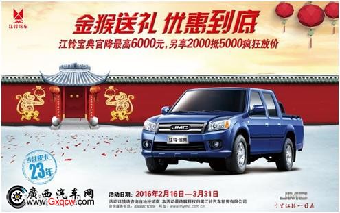 近日,小編走訪廣西江鈴安吉4S店了解到,即日起至3月31日到店購江鈴寶典皮卡即可享受預(yù)交2000元訂車款抵5000元購車款,購車特惠季,江鈴寶典與您同行,欲購車的廣大朋友速速到店搶購吧!咨詢熱線:0771-3119811.