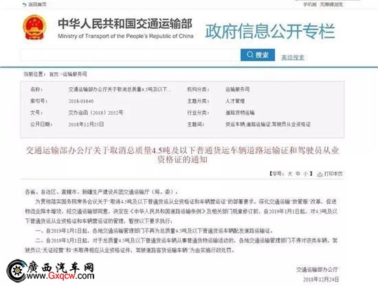 12月25日,在廣大輕卡俠的殷切期盼下,交通運(yùn)輸部正式下發(fā)通知,自2019年1月1日起,取消總質(zhì)量4.5噸及以下普通貨運(yùn)車輛道路運(yùn)輸證和從業(yè)資格證。