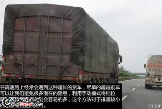 在高速公路行駛時(shí),經(jīng)常會遇到車身很長的重型貨車,這個時(shí)候如果 我們可以盡早的超越前車,可以避免很多隱患,大排量車 型(比如3.5-4.0L)此時(shí)如果深踩油門進(jìn)行超越相對還容易一些,但小排量車型如果要快速超越這種大型貨車就會顯得底氣不足了,這時(shí)就可以利用手動模式降 低擋位后再超車。