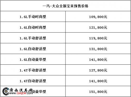 一汽-大眾全新寶來(lái)全系8款車型,預(yù)售價(jià)格如下: