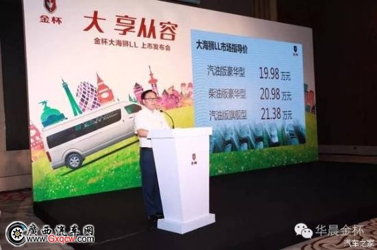 2016年9月2日,金杯大海獅LL上市品鑒會在烏魯木齊希爾頓酒店隆重召開,華晨汽車旗下金杯品牌推出的全新車型——金杯大海獅LL值此盛會開啟區(qū)域上市烏魯木齊站。作為金杯品牌本年度的重磅產(chǎn)品,金杯大海獅LL以18座寬體車身為廣大用戶帶來寬適空間的尊崇禮遇以及更為多元化的乘用選擇,填補了寬體商旅車型的市場空白。金杯大海獅LL的推出,在詮釋金杯品牌價值的同時,展現(xiàn)出金杯車型的卓越性能以及前瞻性的產(chǎn)品布局,鞏固了金杯品牌在國內(nèi)商用車領(lǐng)域的王 者地位。該車售價19.98萬起,18座寬體車身舒展從容視界,雙效動力刷新商旅效能,讓你享受更多,商旅更從容。