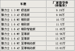 2008年6月10日,廣州豐田正式公布了全球戰(zhàn)略車型雅力士車型的廠家指導價,從9.19萬元到13.63萬元不等。與其它汽車廠商不同的是,雅力士公布的廠商指導價包含了其自身的車輛購置稅。據(jù)廣州豐田4S店銷售人員透露,目前雅力士的實際售價為8.5萬-12.6萬,該價格就是雅力士的開票價。