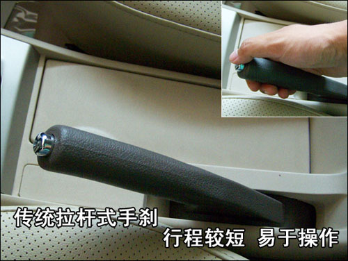 手剎車整體顏色為褐色,與內(nèi)飾基調(diào)基本協(xié)調(diào),無(wú)真皮包裹。實(shí)際操作過程中感覺行程較短,力度適中。