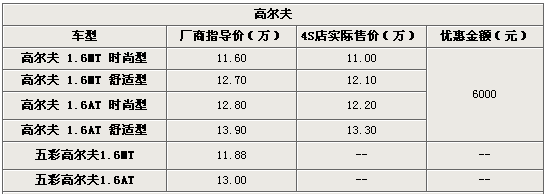 據(jù)4S店銷售人員介紹,消費(fèi)者現(xiàn)在購(gòu)買高爾夫可有6000元的現(xiàn)金優(yōu)惠。各家4S店的現(xiàn)車供應(yīng)比較充足。一汽大眾在奧運(yùn)期間推出了和奧運(yùn)相關(guān)的高爾夫五彩版車型,銷售人員介紹說(shuō),五彩版高爾夫有1.6手動(dòng)和自動(dòng)兩款車型可供選擇,由于是限量版車型,廠家實(shí)行訂單制生產(chǎn),所以現(xiàn)車非常少。消費(fèi)者如要購(gòu)車需先預(yù)定,一個(gè)月后才能提到現(xiàn)車。目前五彩高爾夫在價(jià)格方面也沒有優(yōu)惠。