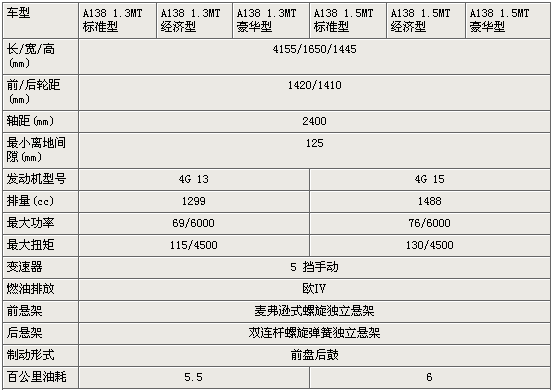 江淮138車(chē)身長(zhǎng)4155mm,與陸風(fēng)風(fēng)華轎車(chē)尺寸基本相當(dāng)。動(dòng)力方面,采用技術(shù)成熟可靠的三菱4G13與4G15發(fā)動(dòng)機(jī),排量為1.3L與1.5L,排放為歐IV標(biāo)準(zhǔn),百公里油耗最低為5.5升,搭載5擋手動(dòng)變速器。前后懸架均為獨(dú)立懸架,乘坐的舒適性將能滿足乘員需求。