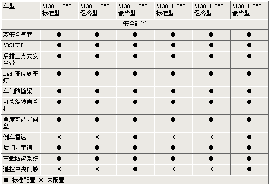 在安全配置方面,A138新車(chē)除了裝備前雙安全氣囊之外,還有ABS+EBD主動(dòng)配置保證安全,同時(shí)車(chē)門(mén)防撞鋼梁、可潰縮轉(zhuǎn)向管柱都為乘員提供更多的保護(hù)。而倒車(chē)?yán)走_(dá)、遙控中央門(mén)鎖只在高配的豪華型才有裝備。