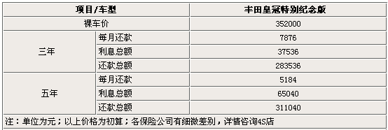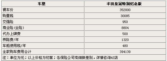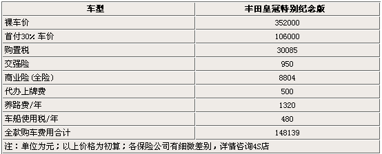 一汽豐田于2008年10月所新推出的皇冠特別紀(jì)念版,是在原有的皇冠2.5L Royal 導(dǎo)航版車(chē)型的基礎(chǔ)上新增了智能鑰匙及一鍵啟動(dòng)裝置等配置,使原本就鐘情于2.5L皇冠(參數(shù)配置 圖庫(kù))的消費(fèi)者們又多了一種選擇。那么對(duì)于想要購(gòu)買(mǎi)該車(chē)的朋友來(lái)說(shuō),分期貸款或全款購(gòu)車(chē)到底要花費(fèi)多少才能把它開(kāi)回家呢?通過(guò)下面的詳實(shí)解析,讓我們一同了解實(shí)際購(gòu)買(mǎi)過(guò)程中的具體花費(fèi)。