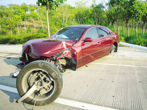 站在車旁的一位青年告訴記者,他是司機(jī)的朋友,當(dāng)時也在車上,所幸兩人都未受傷!氨緛砦覀z是來試試車子高速中的變向能力,因此特地挑選了這個行人稀少、路況較好的路段。當(dāng)時車子開得蠻快,在連續(xù)做了幾次變向后,車子突然失控,一頭撞上路燈柱”。