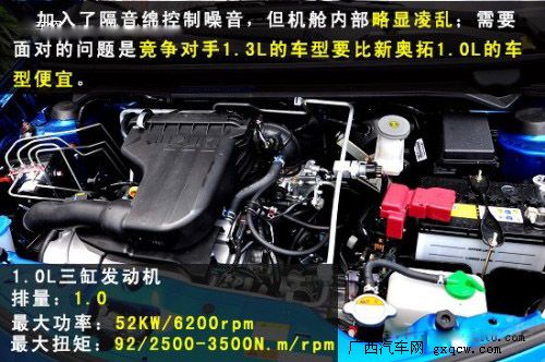 鈴木全新奧拓1.0L自動豪華型,動力方面,新奧拓采用了鈴木新款的1.0升直列三缸發(fā)動機,峰值功率的輸出達到了50kw以上,峰值扭力也在90N·m左右,這比F0的1.0升發(fā)動機(68匹)稍遜一些。壓縮比10:1,據(jù)廠家方面稱,最低每百公里油耗僅有3.6L。排放符合國IV。