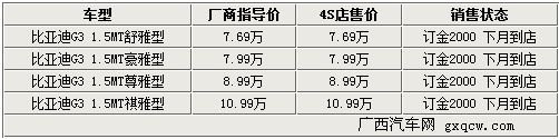據(jù)悉,比亞迪汽車目前在的A3銷售網絡已經有好幾家經銷商,但比亞迪G3仍然沒有現(xiàn)車銷售。據(jù)比亞迪汽車經銷商銷售人員介紹,比亞迪G3由于剛剛上市,現(xiàn)在都無法提供現(xiàn)車銷售,目前只能夠接受預訂,訂金為2000元,最快需要在下月中旬到店。