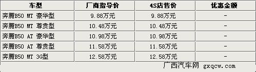 據(jù)一汽奔騰4S店銷售人員介紹,奔騰B50目前的銷售情況非常好,但現(xiàn)在所有車型顏色均不是很全,部分顏色仍需要預訂。消費者如果預訂奔騰B50,需要交付1000元訂金,而且B50自上市起到現(xiàn)在一直沒有任何優(yōu)惠活動。而3G版車型則一直處于無車的狀態(tài),還請消費者諒解。