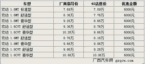 銷售人員表示,現(xiàn)在店內的歡動車型較齊全,全系車型均可享受6000元的現(xiàn)金優(yōu)惠,同時還有1000元至2000元的大禮包贈送,同樣超值,但不可折換現(xiàn)金。