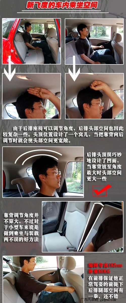 飛度的乘坐空間雖然不錯,但主要是體現(xiàn)在后排腿部,而前后排的頭部空間都不算太理想。至少身高超過185cm的人乘坐就難免會有一點壓抑的感覺,帶天窗的車型表現(xiàn)得尤為明顯。