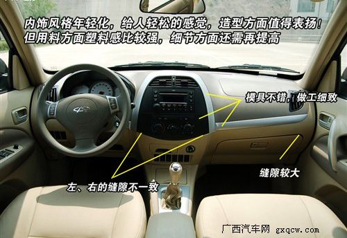 從內(nèi)飾的設(shè)計(jì)上可以看出設(shè)計(jì)者在內(nèi)飾方面以實(shí)用和年輕化為主,三角形黑色的中控臺(tái)與淺色內(nèi)飾中間用銀色裝飾條過渡使視覺上不會(huì)很突兀。造型雖然比較新穎,但是用料依舊是軟肋,實(shí)在沒什么檔次,摸上去看上去都有很強(qiáng)的塑料感,可如果把這歸咎于價(jià)格因素的話也是可以理解,但不均勻的縫隙和細(xì)節(jié)處理卻是奇瑞應(yīng)該努力提升的方面。