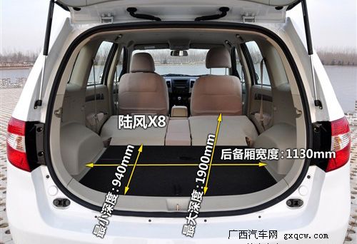 得益于2760mm的軸距,陸風(fēng)的后排空間異常寬大,一般身材的乘客都可以隨意的選擇自己的坐姿,絕對是一種享受,并且放倒后排座椅后,后備廂的深度達到1900mm,別說放東西,就是當(dāng)你工作了累了,也可以躺在后面美美的睡上一覺。