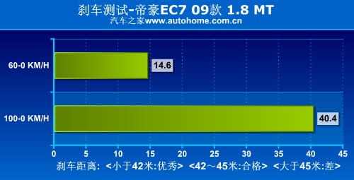 實際上對這么一款純粹家用舒適的車來說,動力方面的要求已經成為用戶需求的次要因素,他們更多關注的是經濟性和舒適性。帝豪EC7的這款1.8升發(fā)動機在油耗方面的表現(xiàn)比較令人滿意,實測平均8.5L/百公里的水平是同級中的佼佼者了。盡管沒有出色的動力(0~100km/h加速時間11.5秒),也沒有復雜的后懸掛(簡單的前麥弗遜后拖曳臂),同時也沒有所謂的操控性,帝豪能夠打動你的就是和諧的外形、豐富的配置、有明顯進步的細節(jié)做工以及不錯的經濟性,哦對,除此之外還有非常不錯的剎車成績,100~0km/h剎車距離40.4米。