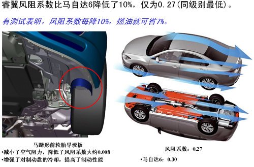 從節(jié)油性能上看,更為合理的車身設(shè)計(jì)使得睿翼2.0L在車身比第一代Mazda6大大加長(zhǎng)的情況下車身自重更輕,與此同時(shí),在不犧牲后排空間及乘坐舒適性的同時(shí)實(shí)現(xiàn)了0.27的同級(jí)別最低風(fēng)阻系數(shù)。