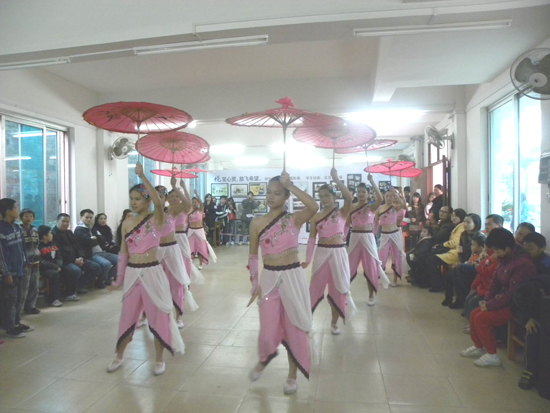 開(kāi)場(chǎng)歌舞是令人震撼的《春歌》,該舞蹈曾榮獲廣西自治區(qū)殘疾人藝術(shù)比賽一等獎(jiǎng)。一群孩子在無(wú)聲的世界里,踏著準(zhǔn)確的節(jié)拍翩翩起舞,整齊劃一的舞步根本不能讓人聯(lián)想到他們是生活在無(wú)聲世界里的孩子們。