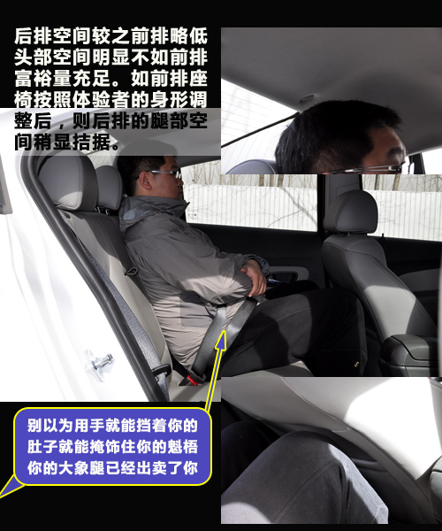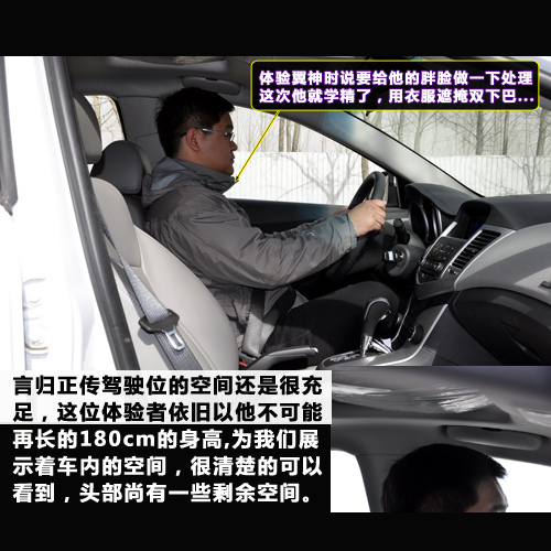 科魯茲前排空間相對還是充足的,身高180cm的旁人坐在其中,頭部尚有很大一塊的富余量。但后排空間就不那么樂觀了,頭部空間明顯沒有前排的充裕,如果前排同樣是180cm的駕駛者,調(diào)整座椅后,后排的膝部與座椅的空間不足一指。