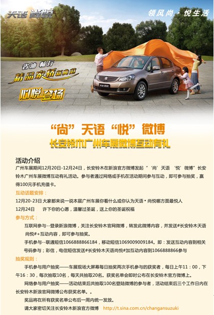 12月20日,第八屆中國(廣州)國際汽車展覽會(huì)正式開幕,作為國內(nèi)三大車展之一,廣州車展不僅吸引了重多汽車廠商參展,而參觀人數(shù)也是逐年增長,影響力不斷提升。為了能在車展中吸引更多參觀者,長安鈴木在車展期間也是組織了豐富多樣的優(yōu)惠活動(dòng),其中為了提升長安鈴木新車型天語尚悅影響力,長安鈴木也是利用時(shí)下新興的交流方式微博,組織了“‘尚’天語 ‘悅’微博”長安鈴木廣州車展微博互動(dòng)有禮活動(dòng)。