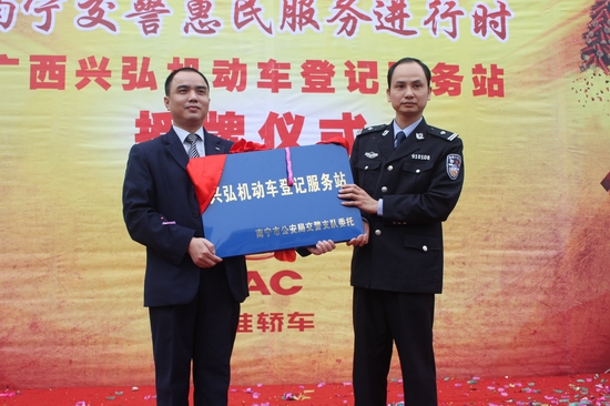 周副所長(zhǎng)向廣西興弘陳謙副總經(jīng)理送上“機(jī)動(dòng)車登記服務(wù)站”牌匾