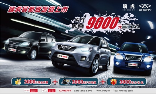 據(jù)奇瑞經(jīng)銷商介紹,本次新推出的瑞虎導(dǎo)航版是在瑞虎經(jīng)典版的基礎(chǔ)上加裝包括具有DVD影音系統(tǒng)、GPS導(dǎo)航、倒車影像系統(tǒng)等功能的DVD智能導(dǎo)航裝備。即日起,凡購買瑞虎經(jīng)典版均可享受包括3000元現(xiàn)金、3000元DVD導(dǎo)航、3000元禮包,共計9000元的三重大禮優(yōu)惠。
