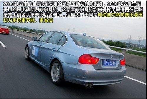 寶馬3系(E90)在2011款之前采用的是液壓助力轉(zhuǎn)向系統(tǒng),而在2011款之后則使用的是Servolectic電動(dòng)助力轉(zhuǎn)向系統(tǒng),這兩套系統(tǒng)都是有采埃孚公司所提供。不同的是后者比前者能耗更低,說白了就是更省油。據(jù)廠方數(shù)據(jù)介紹,光就更換轉(zhuǎn)向系統(tǒng)這一項(xiàng),新款寶馬3系就能比老款按照新歐洲行駛工況(NEDC)標(biāo)準(zhǔn)化行駛循環(huán),每百公里省油0.4L,在城市工況下每百公里省油0.8L。