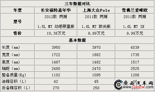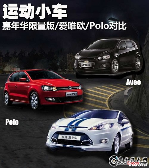 近日,一款限量版的嘉年華車型引起了大家對于運動型A0級小車的關注,動感的車身設計和炫麗的車身顏色使我們對運動型小型車又有了更多的關注,殊不知,除了嘉年華動感限量版之外,大眾Polo和雪佛蘭愛唯歐這兩款小車也同樣具備優(yōu)秀的運動素質(zhì),這三款車良好的安全性和操控能力都使他們擁有不俗的表現(xiàn),而今天選取的這三款,恰恰都是十萬元左右的手動擋車型,更具有可比性。下面我們就一同來看一下這三款小車的實力對比。