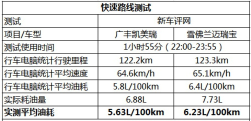 測試之前,先介紹一下兩者規(guī)格:出場的新凱美瑞是2.5Q旗艦版,采用5AR-FE 2.5L發(fā)動機(jī),節(jié)油的主要法寶在于豐田雙VVT-i可變氣門正時和智能諧波增壓進(jìn)氣,并匹配6AT自動變速箱。邁銳寶同樣祭出旗艦版,裝備2.4L SIDI發(fā)動機(jī),具有缸內(nèi)直噴技術(shù),和DVVT雙可變氣門正時技術(shù),同樣匹配6前速自動變速箱。論規(guī)格,邁銳寶略略占先。