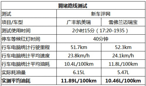 擁堵路況測(cè)試從下午5點(diǎn)半開始,歷時(shí)大約2小時(shí)15分。其中前半段為擁堵最高峰時(shí)期,使得停車等候的時(shí)間累積達(dá)到40分鐘,對(duì)排量更大的凱美瑞2.5稍顯不利。不過后半段車流又比我們以往測(cè)試的時(shí)段明顯少,所以平均車速24km/h又略高于以往。