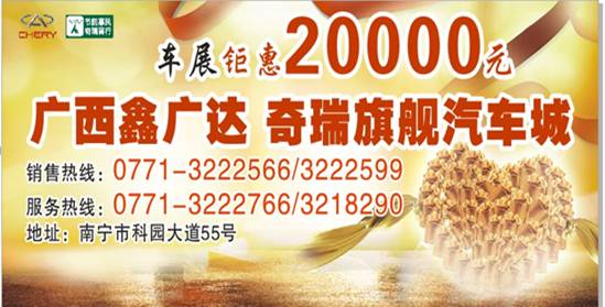 9月29日為期四天的廣西第二十屆汽車交易會正式拉開帷幕,此次車展鑫廣達(dá)奇瑞最高鉅惠20000元。車展期間車友、市民可持奇瑞的宣傳單頁到展位領(lǐng)取精美禮品一份。