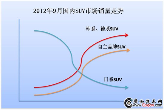 隨著釣魚島問題的持續(xù)發(fā)酵,日系車在中國也慘遭“集體入冬”。9月份,豐田、本田、日產(chǎn)三大品牌在華銷量連連下挫,即便在稱霸多年的SUV市場上,也不得不面對“大權(quán)旁落”的無奈煩惱。不僅韓系、德系品牌SUV上升迅猛,自主品牌更是受到格外關(guān)注,成為9月市場上最耀眼一族。