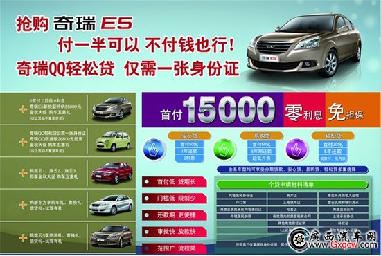 針對不同的消費者,奇瑞E5推出了一系列個貸套餐。其中,“安心貸”適合收入穩(wěn)定的消費者,購車只需首付半價,余款分12期還清,并無需支付利息;“易購貸”針對償還能力不足的消費者,購車也只需首付半價,余款還款期可長達5年,日供最低達到25元,讓購車變得更為輕松;“輕松貸”則面向手頭現(xiàn)金不充裕的消費者,首付僅需1.5萬元,其余部分按揭的低首付貸款組合,輕松實現(xiàn)E5夢想。另外,奇瑞E5還推出了“2-3年期低利率”的個貸方案,除了首付比例在30%以上自由選擇外,消費者還可根據(jù)自身需要選擇貸款期,享受2年期4.99%、3年期6.99%低利率。