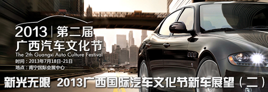 2013第二屆廣西國際汽車文化節(jié)將于7月18日-21日在南寧國際會展中心舉行。本屆廣西國際汽車文化節(jié)將啟用會展中心10個室內(nèi)展廳與室外廣場,展出面積預(yù)計將達到50000平方米。匯集豪華品牌、進口品牌、合資品牌及國產(chǎn)自主品牌等主流品牌入駐。7月廣西國際汽車文化節(jié)必將成為上半年所發(fā)布的新車集中展示秀臺。本次車展還將為上半年上市新車特別設(shè)立新光大道活動,為此我們不妨將發(fā)布新車匯總,來看看哪些新車將可能登陸本屆廣西國際汽車文化節(jié)新光大道的舞臺。