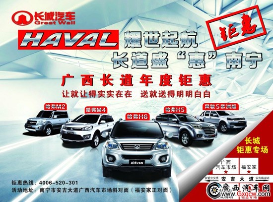 4月28日至5月1日,安吉第二十一屆汽車交易會上即將舉行,買長城汽車到廣西長道鉅惠專場,H6 1.5T、H6 2.0T、H6 2.0汽油、哈弗H5,哈弗M2,M4,長城風駿5、長城金迪爾,車展購車優(yōu)惠享不停,車展鉅惠專場等您來,震撼優(yōu)惠讓您爽到底!【廣西長道車展熱線:0771-2330301 (安吉4S店);0771-6735498(白沙4S店);0771-3922501(安吉直營店) 】